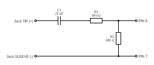 Moja propozycja to zbudowanie takiego układu z dwóch rezystorów: R₁ = 68 kΩ oraz R₂ = 680 Ω. Pozwoli nam to na ok. stokrotne (-40 dB) zmniejszenie prądu. Dodatkowo układ powinien dość dobrze wpasować się w optymalną impedancję dla złącza mikrofonowego (zgodnie z instrukcją jest to 600 Ω)3.