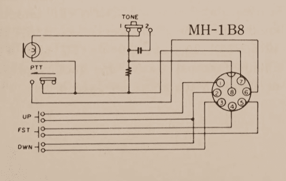W instrukcji mamy jedynie rozrysowany schemat połączeń mikrofonu MH-1 B8. Na jego podstawie możemy wywnioskować, że piny 7 i 8 odpowiadają za przesyłanie sygnału z mikrofonu. Pozostałe piny nas nie interesują, ich zadaniem jest obsługa przycisków oraz PTT.