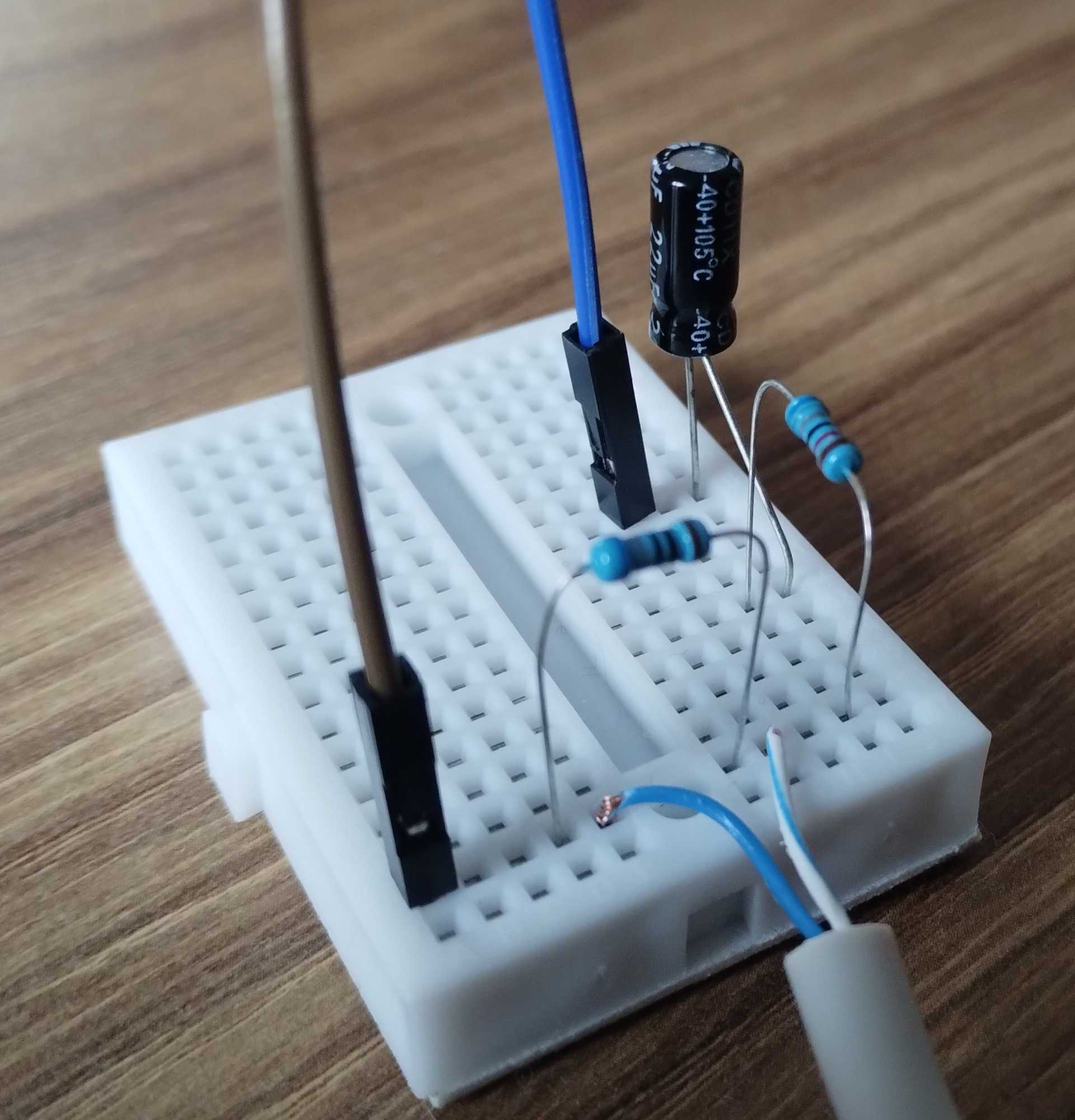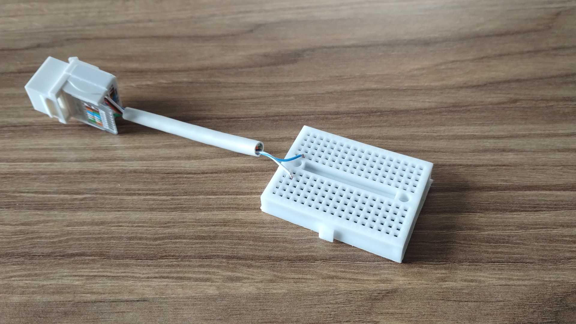 Pierwszym krokiem będzie wyprowadzenie połączenia do tych dwóch pinów na płytkę stykową. Zdecydowałem się wykorzystać kabel z mojego mikrofonu i wpiąć go do specjalnie przygotowanego gniazda RJ-45. Alternatywnie można także zarobić wtyk mikrofonowy na skrętkę.
